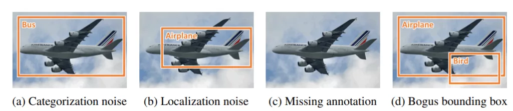 - Bruit de classification (Categorization) : Attribution d’une mauvaise étiquette de classe (ex: annoter une « voiture » au lieu d’un « camion »).