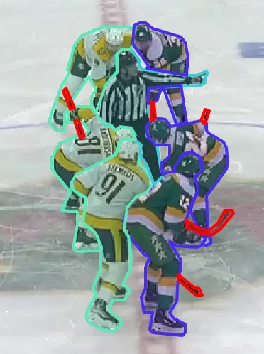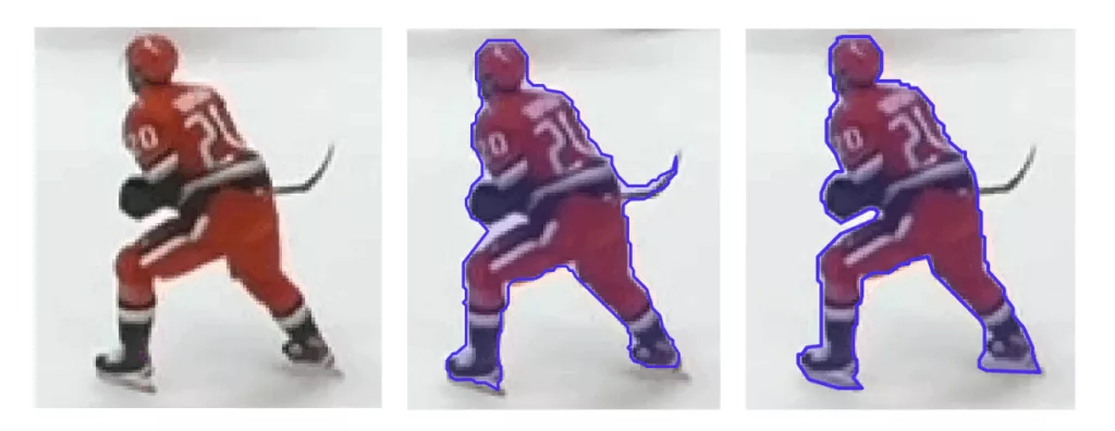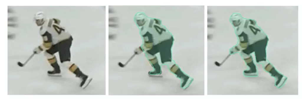 Exemples d’annotation d’un joueur de hockey en utilisant la Bbox SAM puis corrections marginales effectuées par l’annotateur.